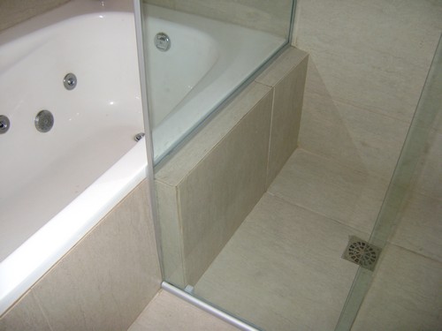 Mamparas corredizas conectadas a fijos contra una bañera.